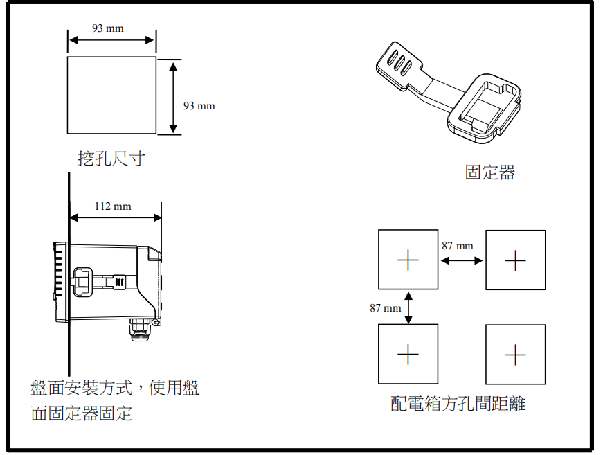 1 主機固定 本傳送器可盤面式、2 吋管式、壁掛式安裝,盤面式安裝請預先在配電箱面板上留一93 mm x 93 mm 的方孔,傳送器從配電箱之面板直接放入,將傳送器所附之固定器由後方套入,卡進固定槽內。