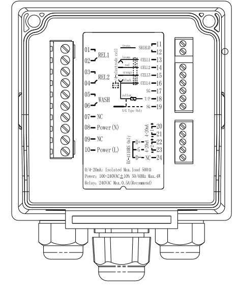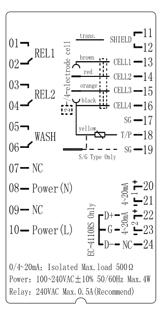 3 背板端子接點說明 REL1:第一點警報控制,外接繼電器接點。 REL2:第二點警報控制,外接繼電器接點。 WASH:外接清洗裝置繼電器接點。 NC:空腳。 Power(N):100~240AC 電源接線端。 NC:空腳。 Power(L):100~240AC 電源接線端。 SHIELD:接電極訊號線之透明線。 CELL1:接電極訊號線之 Current electrode 1。 CELL2:接電極訊號線之 Voltage electrode 1。 CELL3:接電極訊號線之 Voltage electrode 2。 CELL4:接電極訊號線之 Current electrode 2。 SG:NC。 TP:接電極訊號線之溫度線。 SG:NC。 4~20mA+端:主測量電流輸出接點+端,供外接記錄器或 PLC 控制。 4~20mA-端:主測量電流輸出接點-端,供外接記錄器或 PLC 控制。 4~20mA+端 / D+(B):RS-485 輸出之 D+(B)。 4~20mA -端 / G:RS-485 輸出之 GND。 NC / D-(A): RS-485 輸出之 D-(A)。